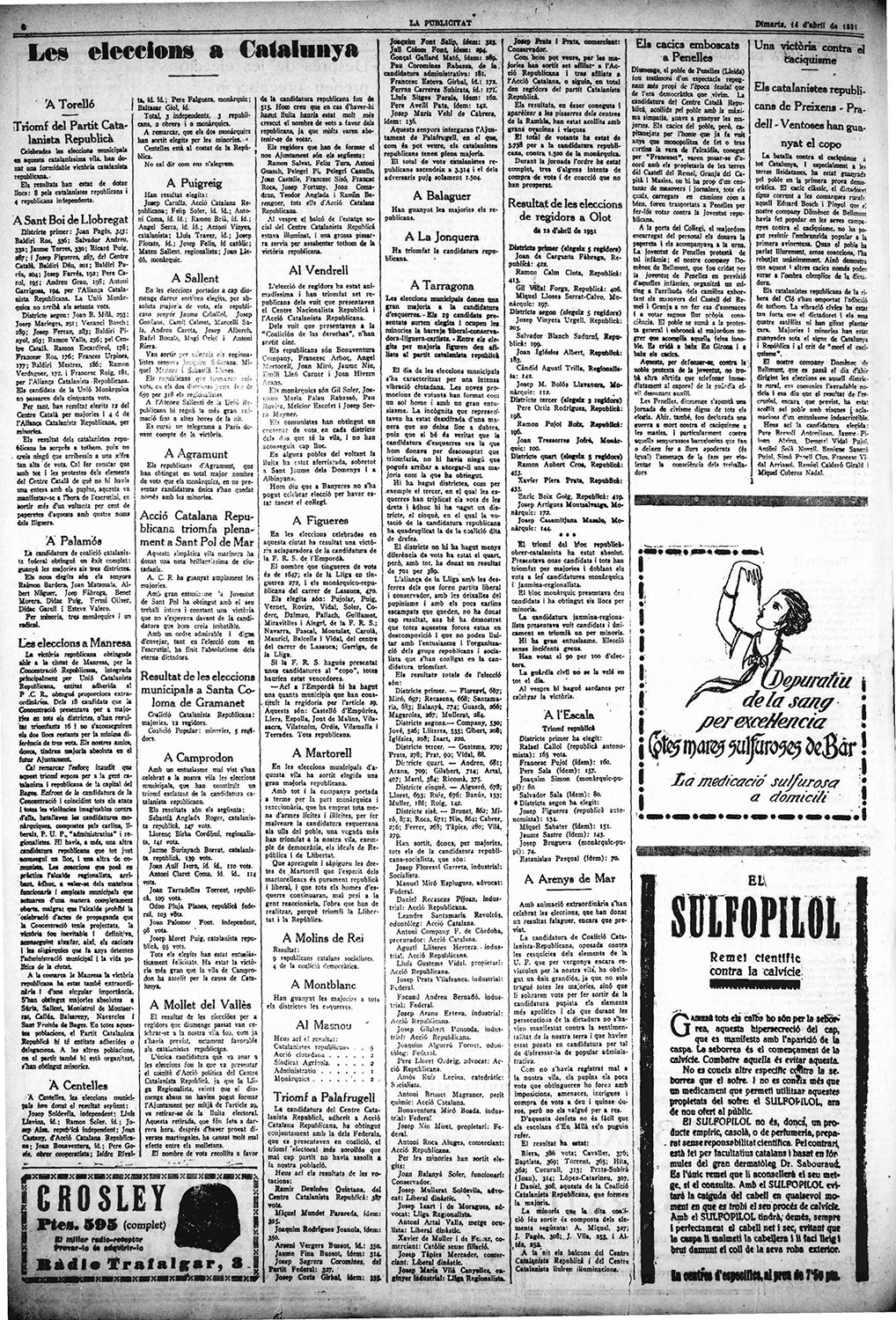 La Publicitat el dia 14 d’abril donava els resultats de les eleccions municipals a Centelles, indicant la filiació política dels 10 regidors escollits: