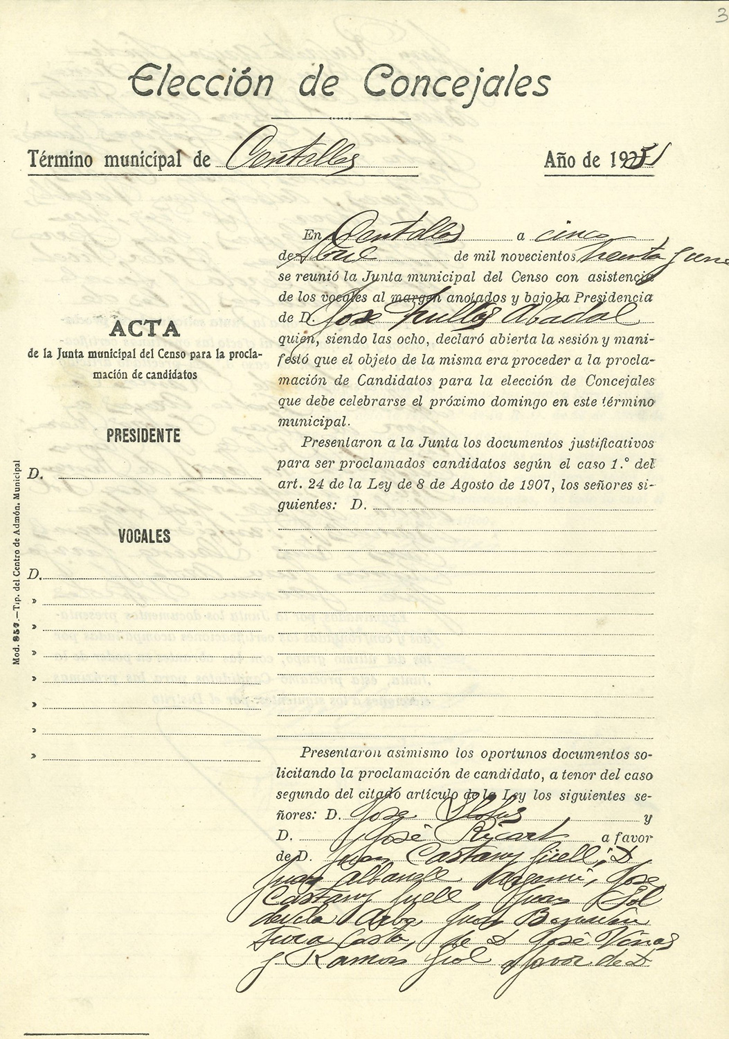 Josep Soldevila, independent; Lluís Llavina, id.; Ramon Soler, id.; Josep Ayza, republicà independent; Joan Castany, d’Acció Catalana Republicana; Joan Bonaventura, id.; Pere Gorés [sic], obrer cooperativista; Isidre Ribalta, id. id.; Pere Falguera, monàrquic; Baltasar Giol, id.Total, 3 independents, 3 republicans, 2 obrers i 2 monàrquics.