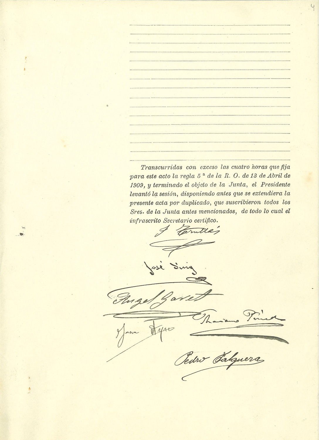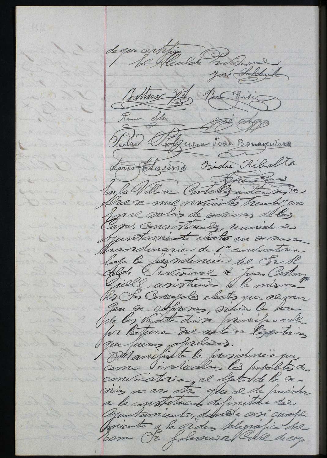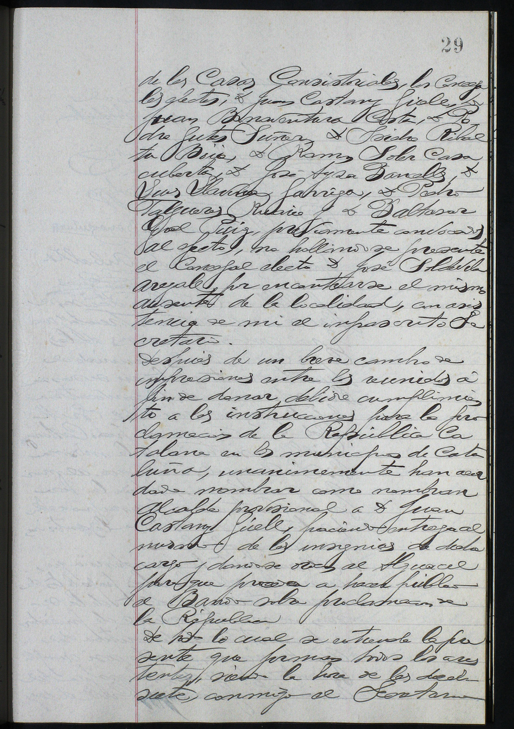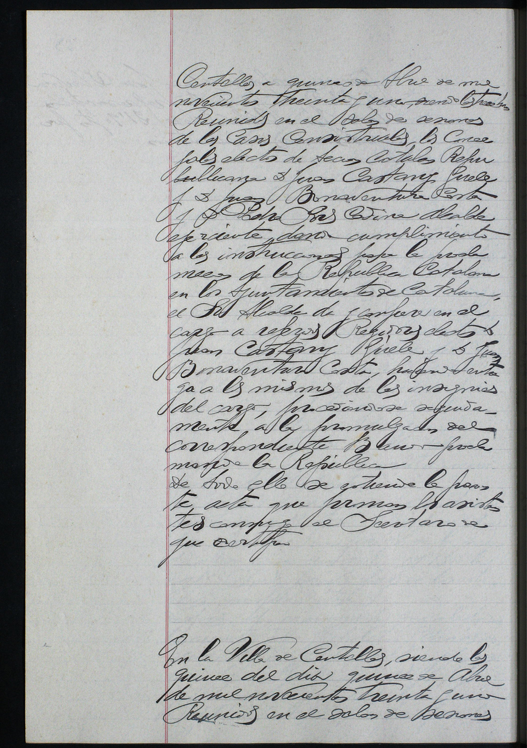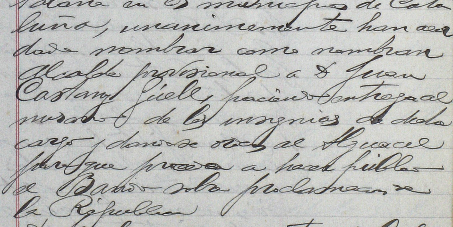 Después de un breve cambio de impresiones entre los reunidos a fin de donar debido cumplimiento a las instrucciones para proclamación de la República Catalana en los municipios de Cataluña, unánimemente han acordado nombrar como alcalde provisional a D. Juan Castany Güell haciendo entrega al mismo de las insignias de dicho cargo y dándole orden al Alguacil para que proceda a hacer público el bando sobre la proclamación de la República.