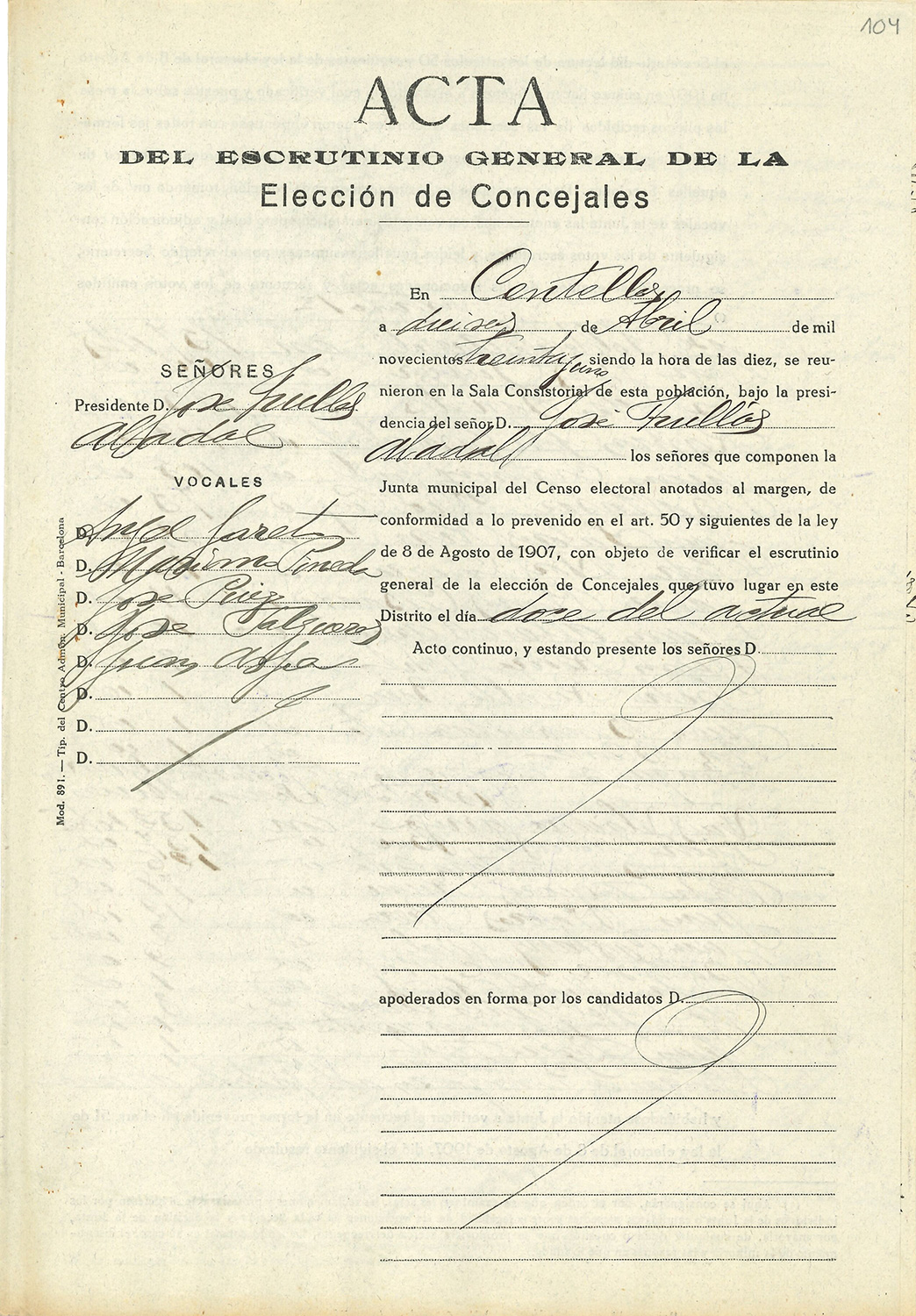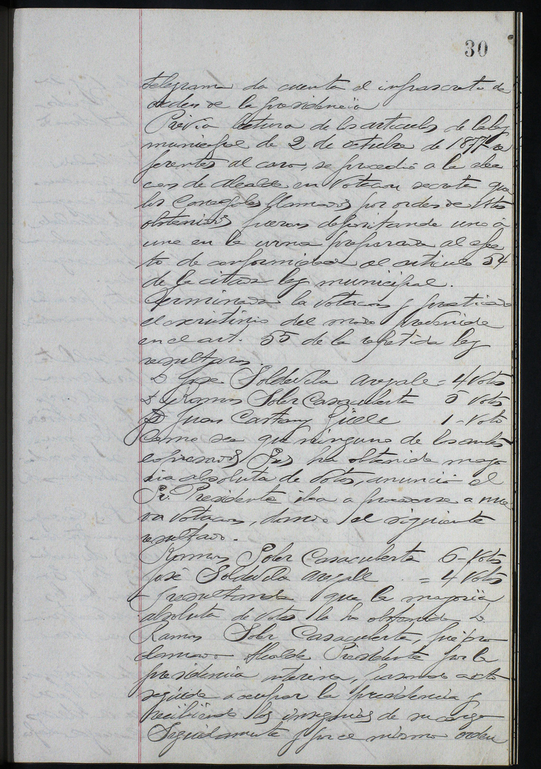 Prèvia lectura de los artículos de la Llei Municipal del 2 d’octubre del 1877 referentes al caso, se procedió a la elección de alcalde en votación secreta que los Concejales llamados por orden de votos obtenidos fueron depositando de uno en uno en la urna preparada al efecto de conformidad al artículo 54 de la citada ley municipal.