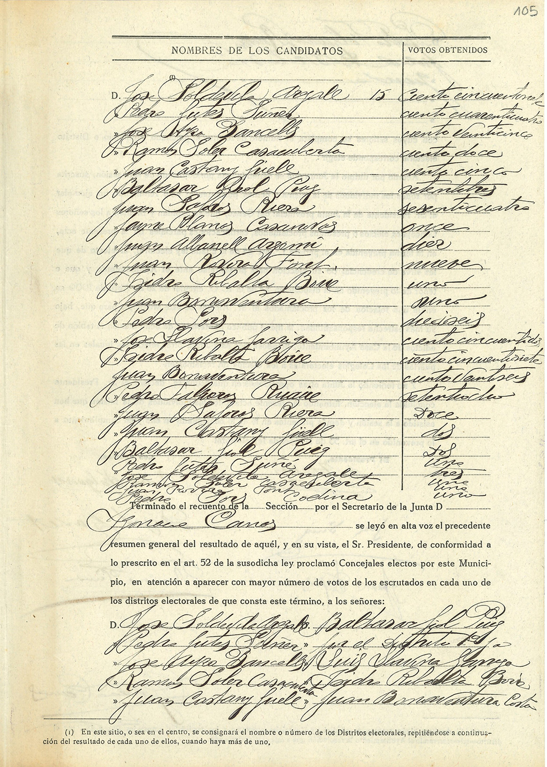 La votació es va iniciar a les 8 del matí i fins a les 4 de tarda els electors van tenir temps de dipositar a l’urna una papereta plegada amb el nom o noms dels seus candidats. Després va començar l’escrutini que també va transcórrer sense incidències. El resultat va ser el següent: