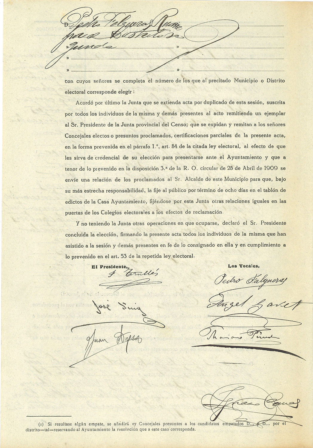 Districte 1: Josep Soldevila Aregall, Pere Gutés Suñer, Josep Ayza Bancells, Ramon Soler Casacuberta, Joan Castany Güell i Baltasar Giol Puig.
